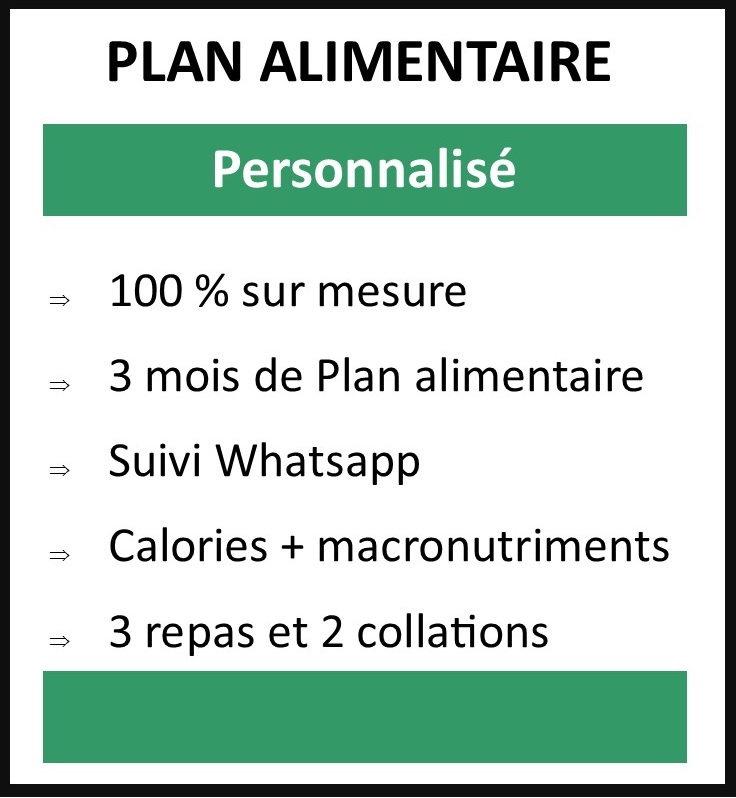 Nous concevons pour vous un plan alimentaire suivant votre objectif et vos informations (âge, taille, poids, activités).